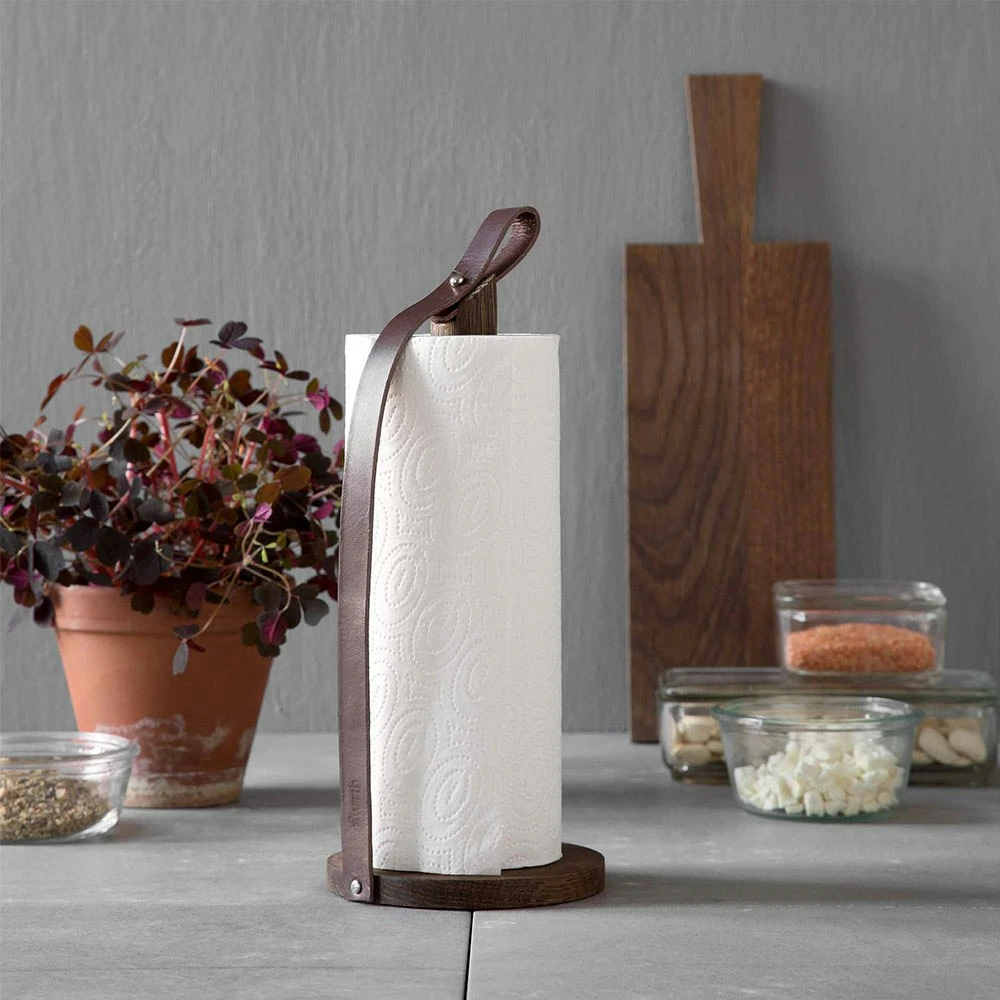 Hænder på er en moderne og enkel køkkenrulleholder fra af Wirth. Det er lavet af skandinavisk eg med smukke synlige vækstringe og en funktionel læderrem, der holder papirrullen på plads.
